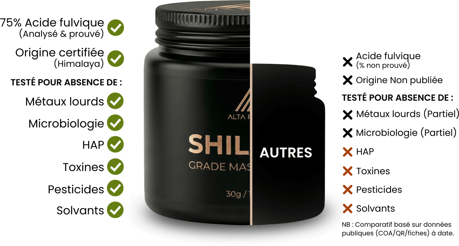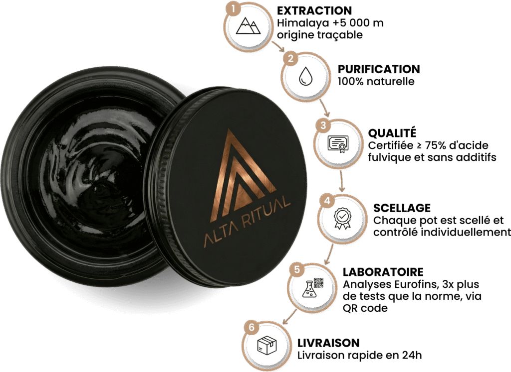Sur un marché saturé de Shilajit invérifiables, la solution n’est pas d’y croire, c’est de l’exiger : Alta Ritual propose le Shilajit GRADE MASTER RESIN™, testé lot par lot, avec des résultats accessibles et un niveau de contrôles documentés 3 fois plus élevé que la moyenne du marché.