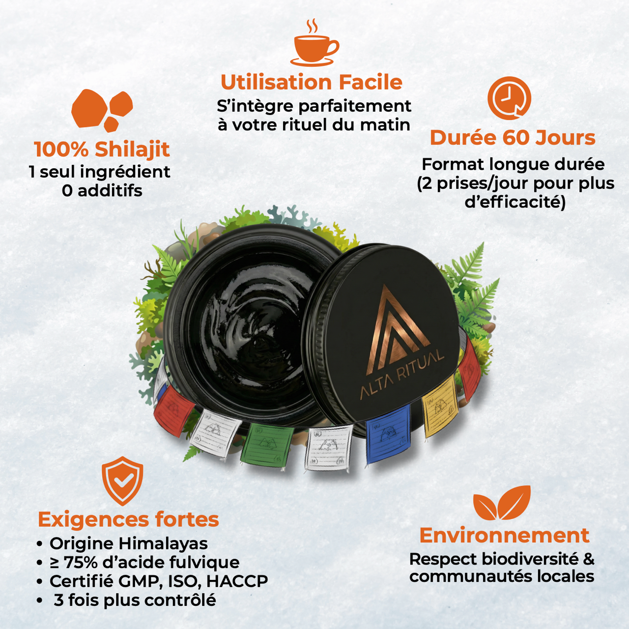 L’acide fulvique est un composant naturellement présent dans le shilajit et utilisé comme indicateur de concentration de la résine. Un taux à 75% ou plus est considéré comme élevé, ce qui indique une résine plus dense et moins diluée que des produits affichant des taux plus bas. Chez Alta Ritual, ce taux est mesuré lot par lot, indiqué sur les analyses Eurofins, et vérifiable en 10 secondes via le QR code sur le pot.
