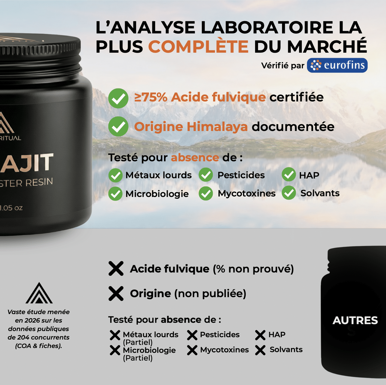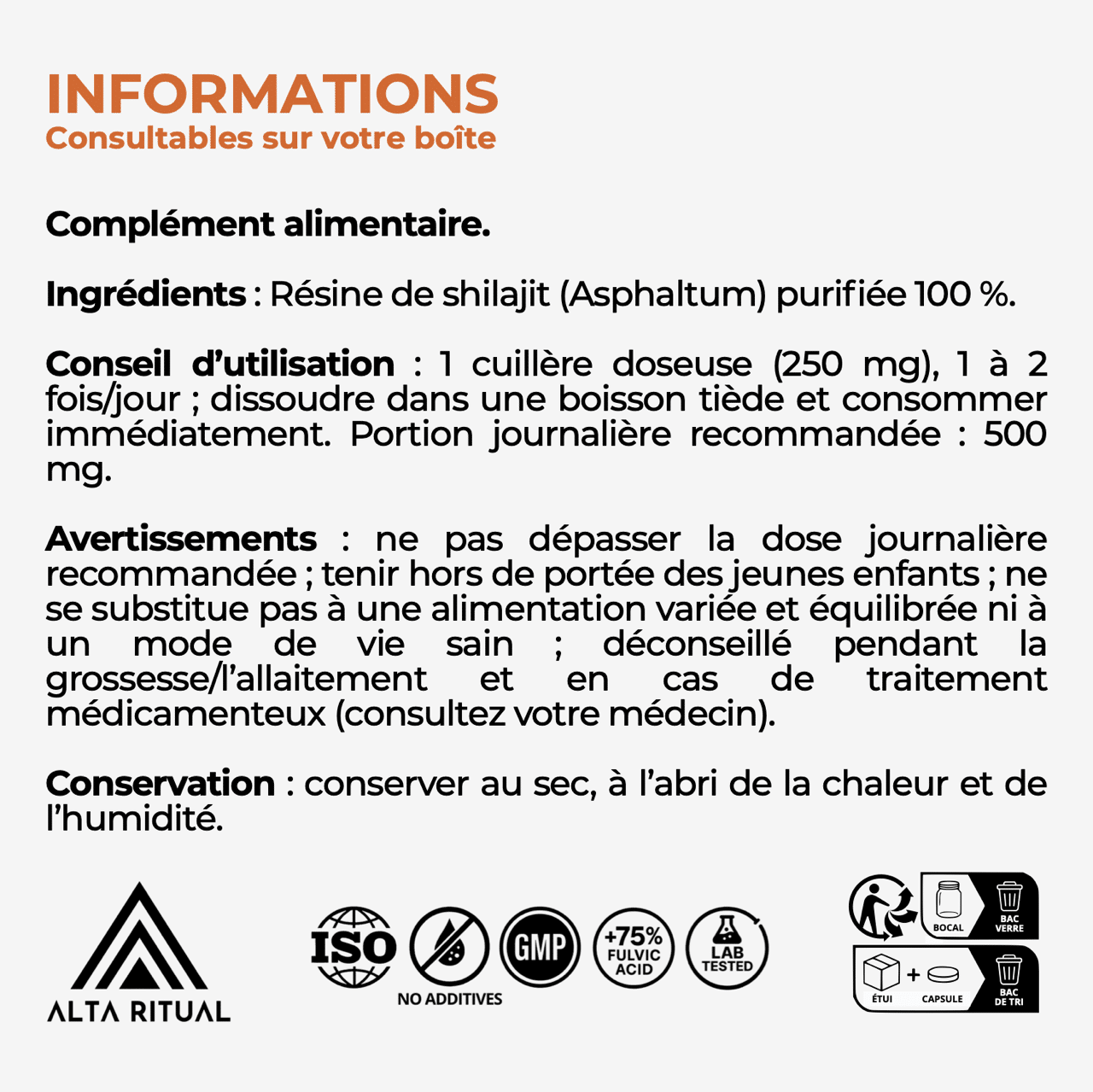 Le shilajit est commercialisé comme denrée alimentaire complémentaire. Sur le marché, beaucoup de marques se contentent d’un contrôle minimal, parfois incomplet, parce que ce n’est pas un “médicament” et que la rigueur varie énormément d’un acteur à l’autre. Alta Ritual fait l’inverse : panel complet et résultats publics.