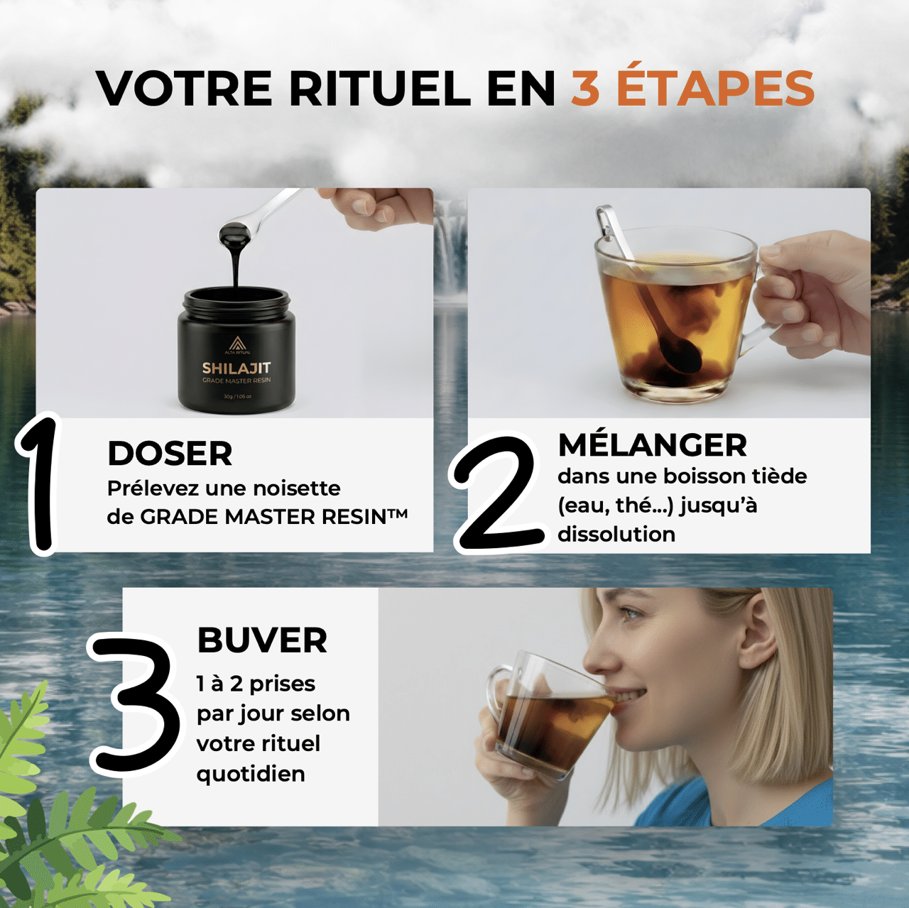 Chaque matin, votre rituel dure 2 minutes. Versez 250 mg de résine (1 cuillère) dans une eau tiède, remuez et buvez. Vous pouvez répéter l’après-midi, sans dépasser 500 mg par jour.